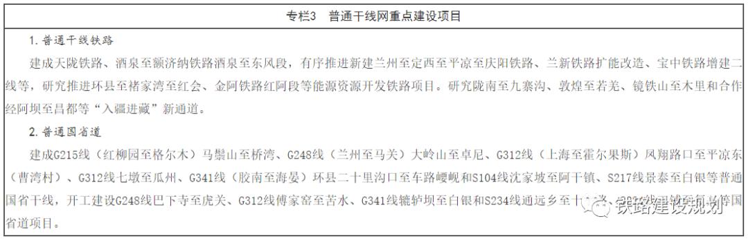 ——优化普通干线铁路功能布局。加快构建以陇海—兰新铁路为轴的“鱼骨状”路网布局,建成天陇铁路,有序推进新建兰州至定西至平凉铁路、环县至褚家湾至红会铁路和宝中铁路增建二线,补齐陇东南地区普通干线铁路网短板,加快实现东部成网。建成酒泉至额济纳铁路酒泉至东风段,开展敦煌至若羌(罗布泊)等铁路前期研究,提高河西地区铁路网覆盖面。推进资源能源开发线路建设和既有线扩能改造,配套建设园区铁路专用线和铁路集疏运支线,提升陇煤入川能力和疆煤、蒙煤入甘运力。
