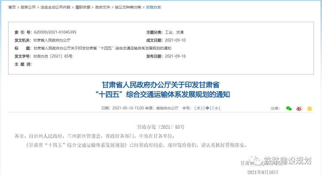 9月16日,甘肃省人民政府办公厅正式印发《甘肃省“十四五”综合交通运输体系发展规划》。