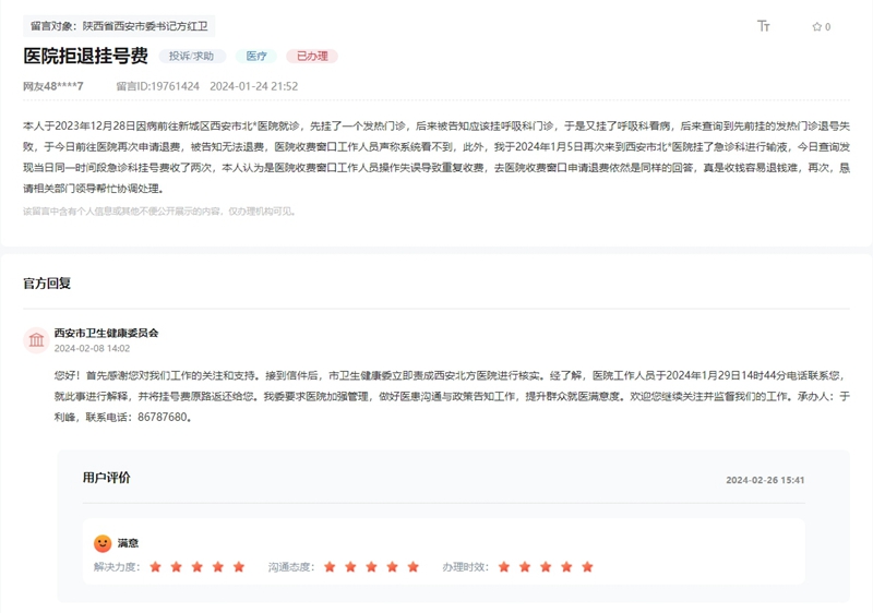 接到留言后,西安市卫生健康委员会立即责成西安北方医院进行核实,了解事件原委后将挂号费原路返还给网友。西安市卫生健康委员会在回复中表示,已要求医院加强管理,做好医患沟通与政策告知工作,提升群众就医满意度。