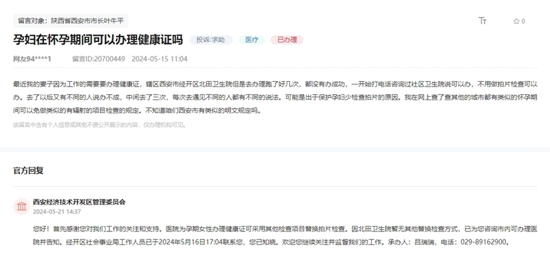 西安经济技术开发区管理委员会在回复中表示:医院为孕期女性办理健康证可采用其他检查项目替换拍片检查。因北田卫生院暂无其他替换检查方式,已咨询市内可办理医院并告知。