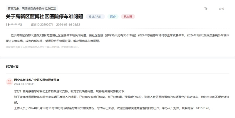 西安高新技术产业开发区管理委员会回复称,“对于蓝博社区医院停车场外来车辆不准进入的问题,已经和交警部门核实,并已经协调,预留部分车位,对进入社区医院看病的车辆可允许临时停车。”