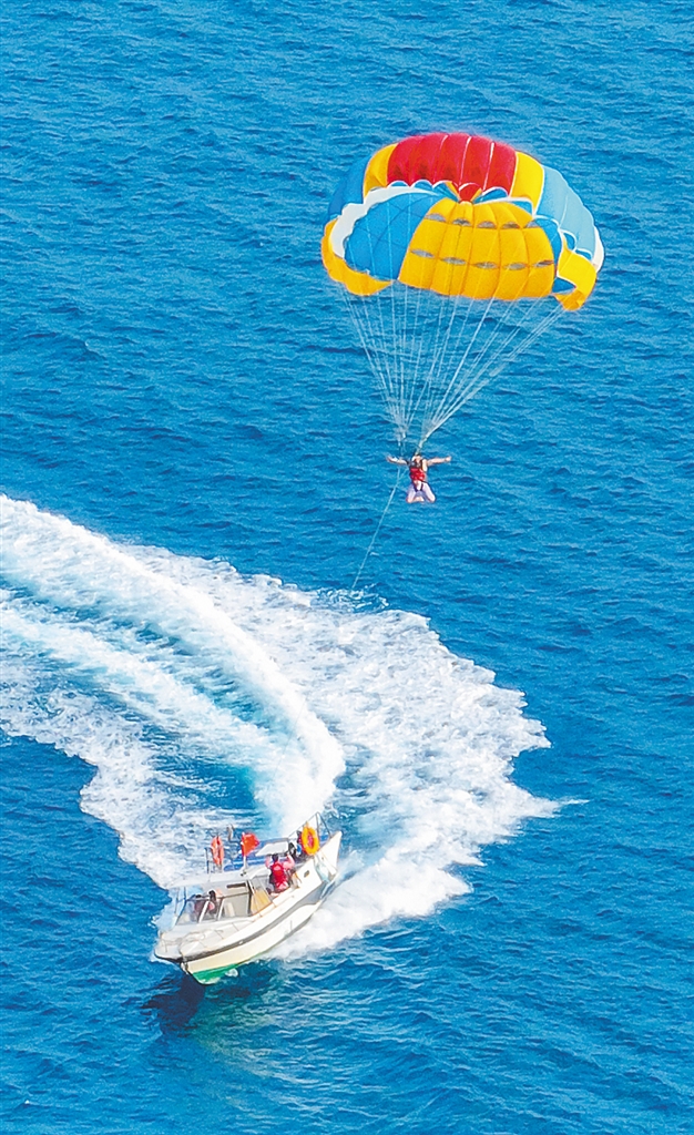 在海南陵水,游客乘游艇驰骋,体验水上游玩项目。记者王程龙摄