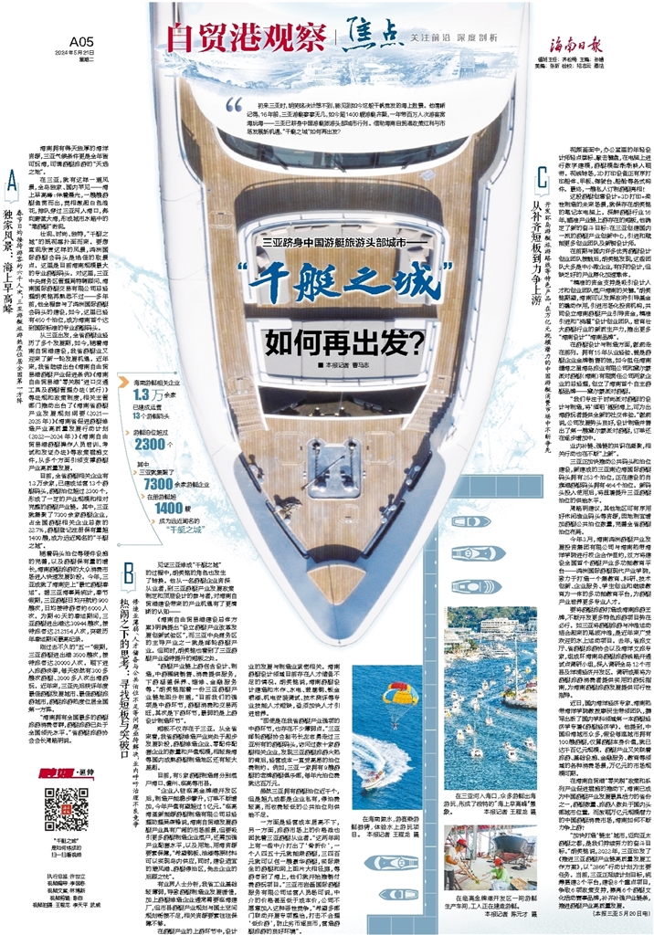 目前,全省游艇相关企业有1.3万余家,已建成运营13个游艇码头,游艇泊位超过2300个,形成了一定的产业规模和相对完整的游艇产业链。其中,三亚就集聚了7300余家游艇企业,占全国游艇相关企业总数的22.7%,游艇登记注册保有量超1400艘,成为远近闻名的“千艇之城”。