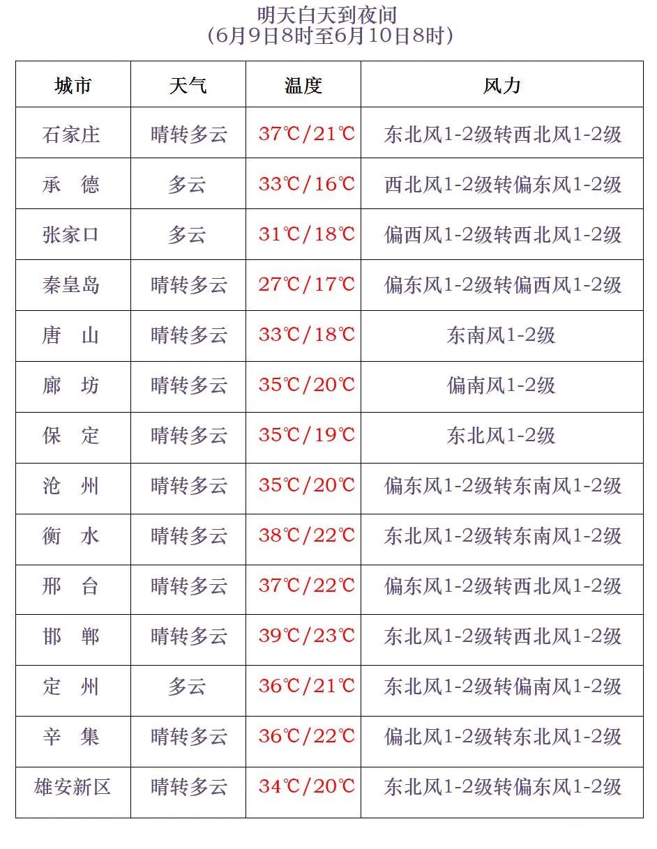 明天夜间到10日,张家口、承德和保定、石家庄、邢台、邯郸四个地区的西部多云转阴有雷阵雨或阵雨,其他地区多云间晴。