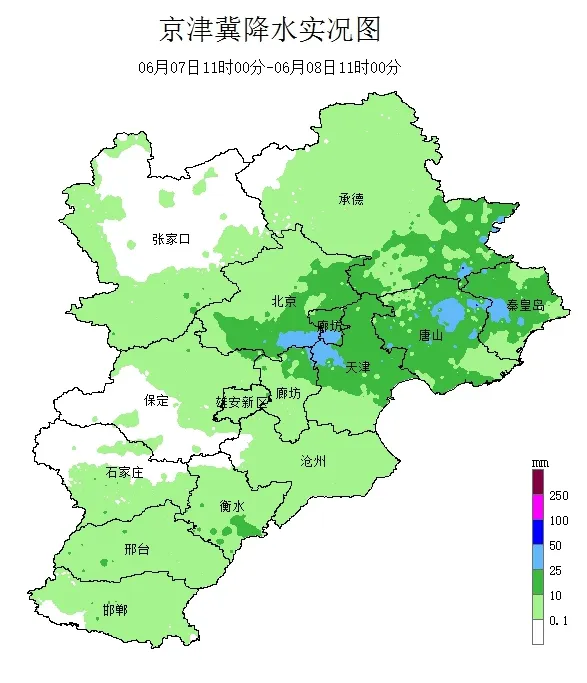 过去24小时内河北大部地区出现了分布不均的降水天气,根据国家站和区域站数据统计,7日11时至8日11时,河北共166个县市区2498个监测站出现了降水。