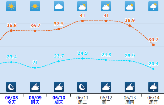 预计6月8日至13日,华北中南部、黄淮、江汉北部以及新疆、内蒙古西部等地将出现持续性高温天气,高温日数有3~5天;10日至13日为高温最强时段,河北南部、河南、山东、陕西关中平原、新疆北部和东部等地部分地区最高气温可达39~42℃。