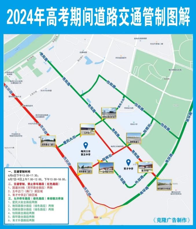 梅河口市2024年高考将于6月7日至9日在教育园区第五中学和育才中学进行,为给考生及家长创造安全、有序、畅通的交通环境,梅河新区公安局交警支队依据《中华人民共和国道路交通安全法》第39条规定,决定对上述两个考场周边道路实施临时交通管制措施。
