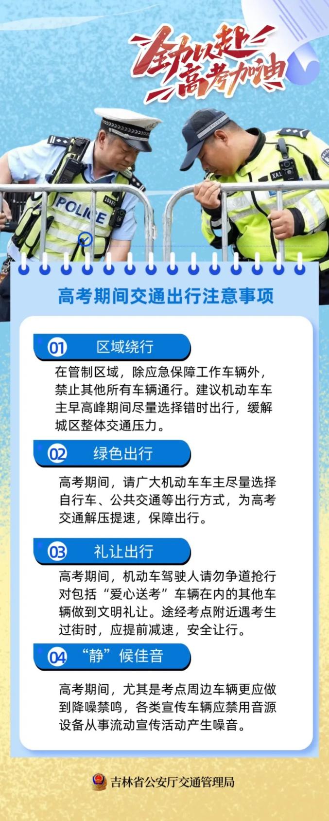 为确保高考期间考场周边道路交通安全、稳定,为广大考生营造良好的考试环境,延边州公安交警部门决定对考场周边部分道路实施临时交通管制,期间禁止各类机动车、考试无关人员进入交通管制区域,禁止车辆鸣笛。