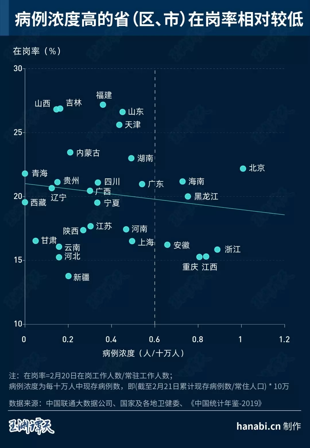 我们再将湖北以外的各地区“在岗率”与它的病例浓度(单位人群里的“新冠肺炎”现存确诊数)进行比对分析,就出现了下面这个图表: