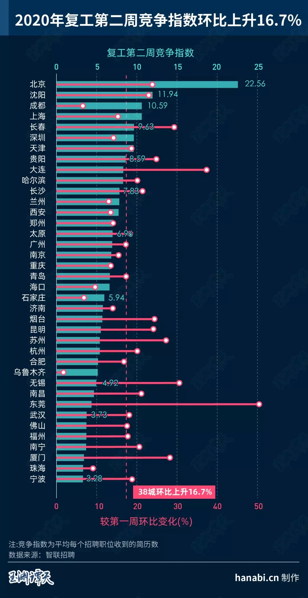 智联招聘的数据显示,复工第二周的招聘职位数较第一周环比增加了30%,简历投递量环比增长近6成。相比第一周,各城市的招聘竞争指数均获得提升,其中最高的北京已经达到了22.6,也就是说平均每个岗位能收到22.6份简历;而环比提升最快的是东莞,竞争指数比第一周上升50%以上。