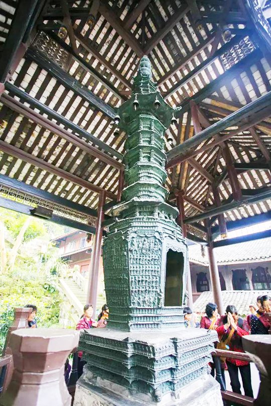 华严宝塔是在伏虎寺大雄宝殿的左上方,这个塔铸造于明朝万历十三年,华严宝塔是伏虎寺的镇寺之宝。这样一座精美而巨大的铜塔铸造于将近八百年前,而且是一次铸造完成,整座塔高度有5.8米,塔身没有任何拼接的痕迹。