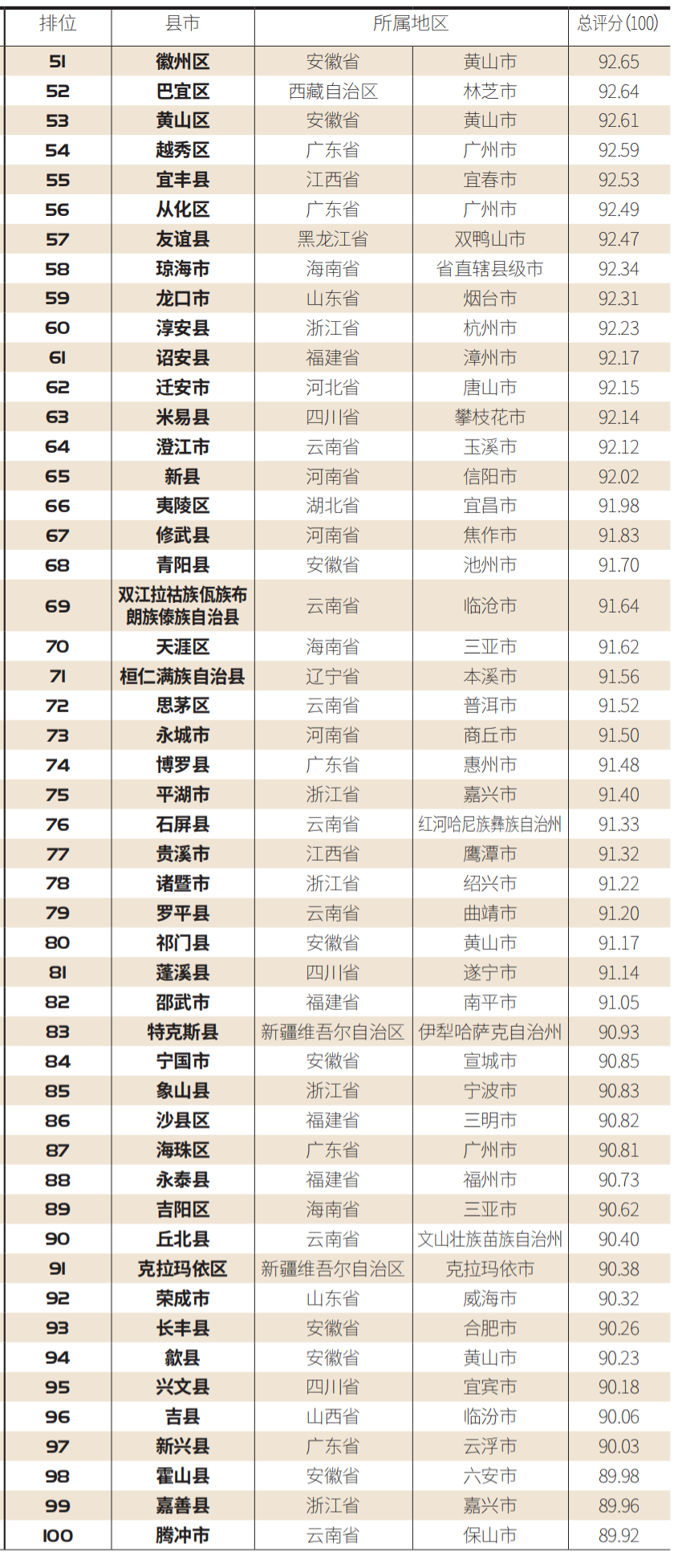 在2757个县市的康养综合测评角逐中,县级单位53个、县级市27个、省会及地区级城市所辖区20个,县级单位所占比例最高,远远领先于县级市、省会及地区级城市所辖区之和。