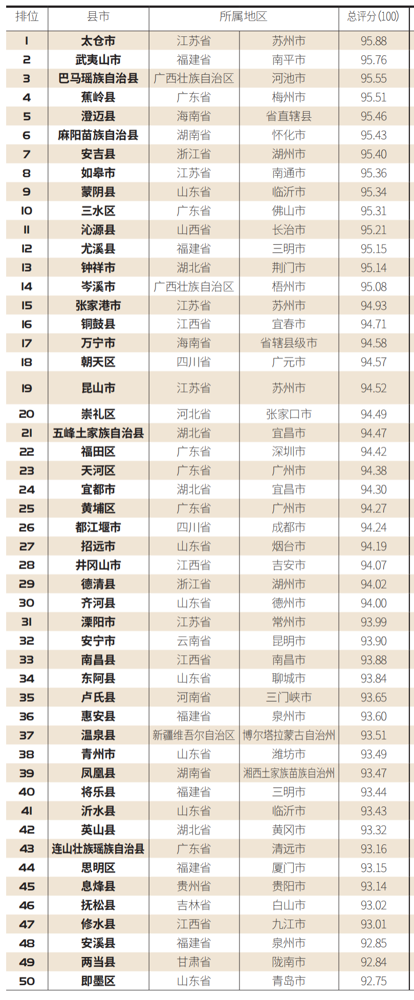 近日,“2021中国康养百佳县市”榜单新鲜出炉,客观反映了县域康养的发展状况。在这份名单中,榜单前十名分别为江苏省苏州市太仓市、福建省南平市武夷山市、广西壮族自治区河池市巴马瑶族自治县、广东省梅州市蕉岭县、海南省直辖县澄迈县、湖南省怀化市麻阳苗族自治县、浙江省湖州市安吉县、江苏省南通市如皋市、山东省临沂市蒙阴县、广东省佛山市三水区。