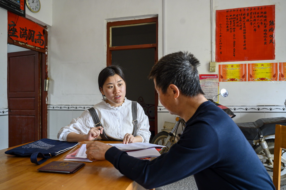 2021年4月3日,井冈山市东上乡,谢萍与对点帮扶的居民核对信息。