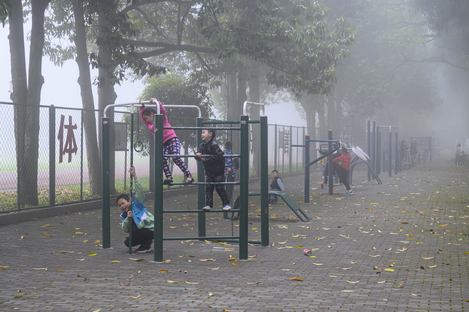2021年4月4日,井冈山市,孩子们在体育馆旁玩耍。