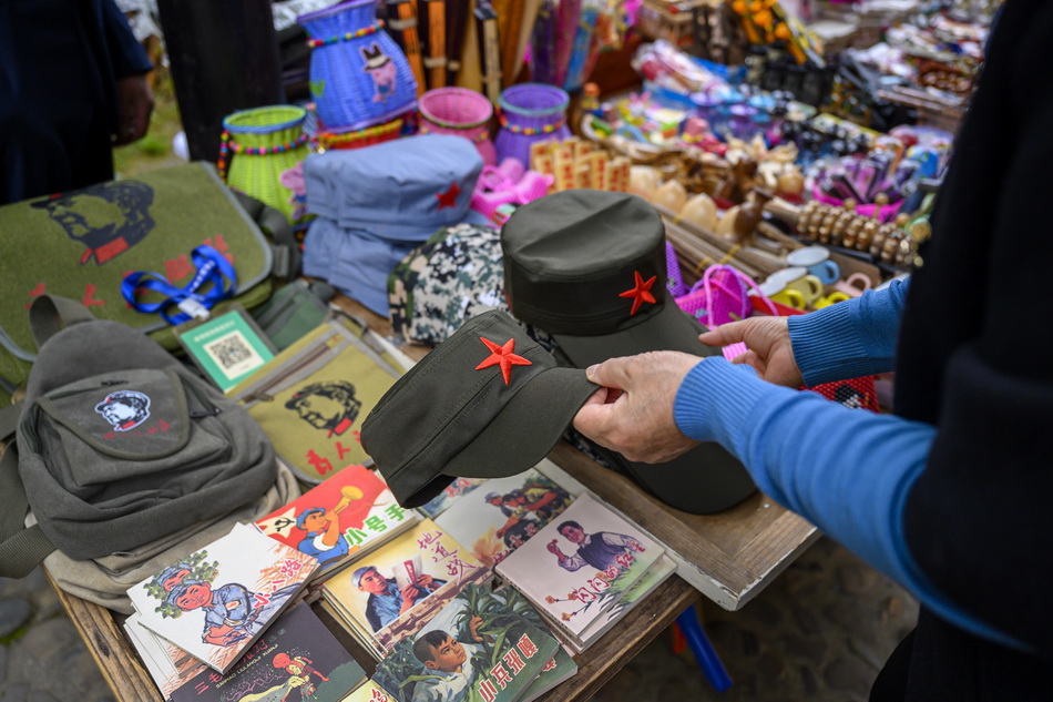 2021年4月4日,一位前来井冈山旅游的游客给孙子挑选礼物。