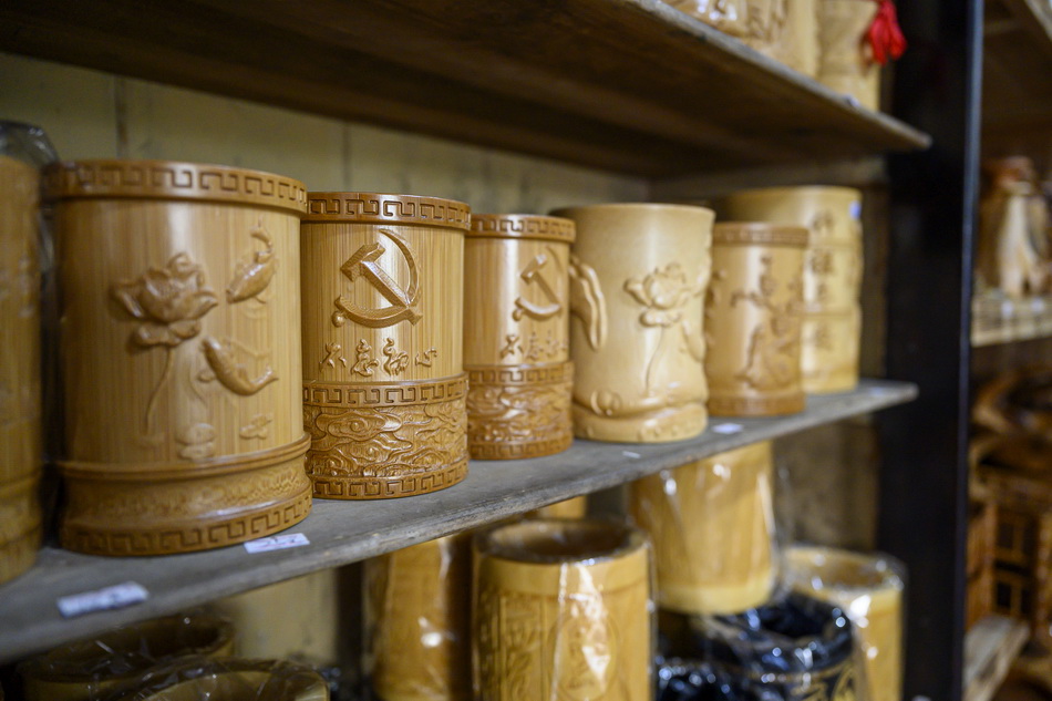 2021年4月3日,井冈山神山村,左香云的手工艺品上雕刻着“不忘初心”字样。