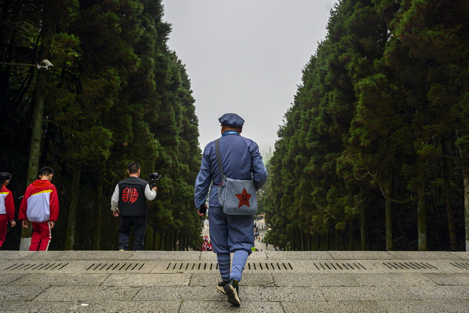 2021年4月4日,井冈山市,一位穿着红军装的游客在井冈山革命烈士陵园。