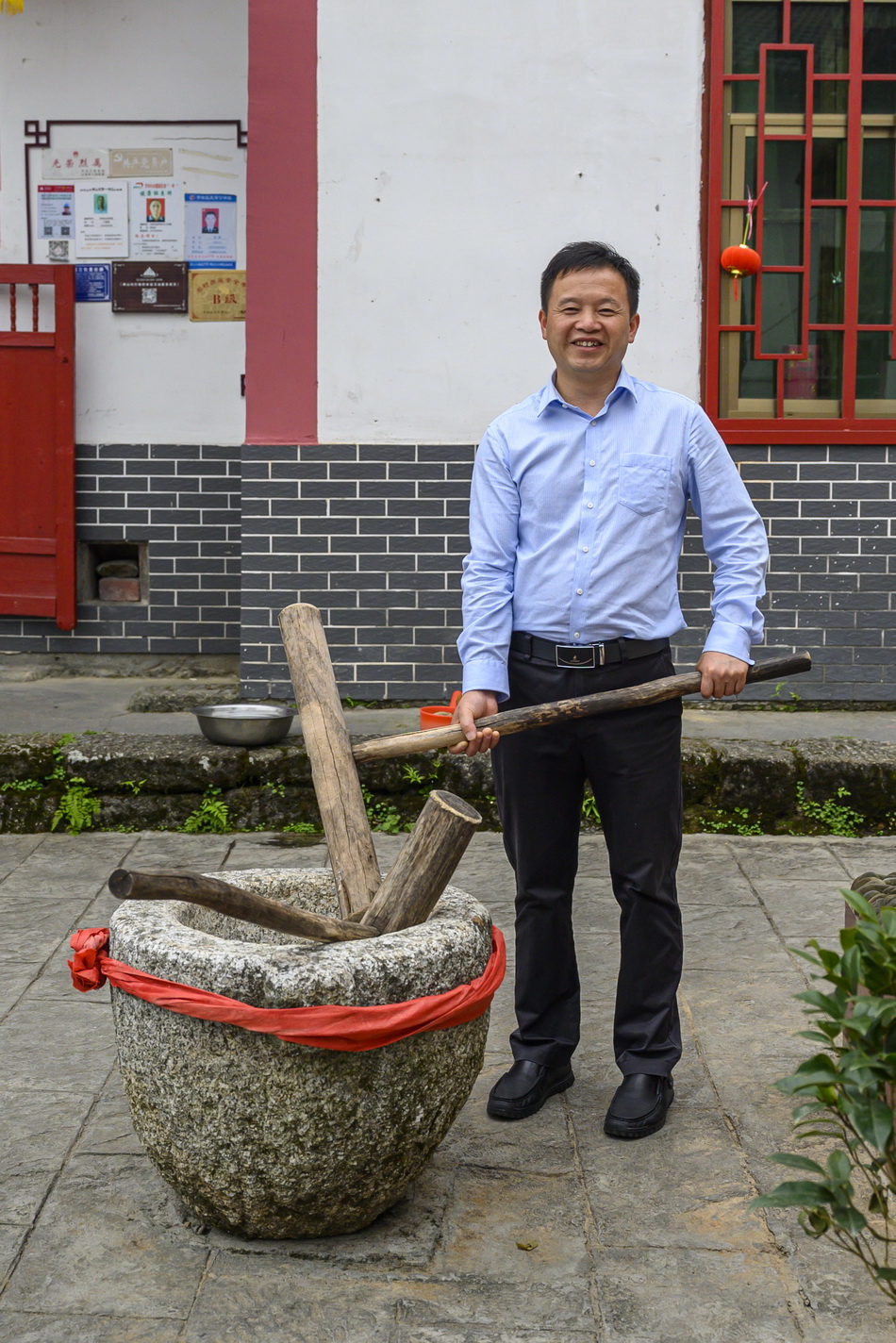 2021年4月3日,井冈山市茅坪乡神山村,左香云拿着杵棍站在习总书记曾经打糍粑的地方留影。