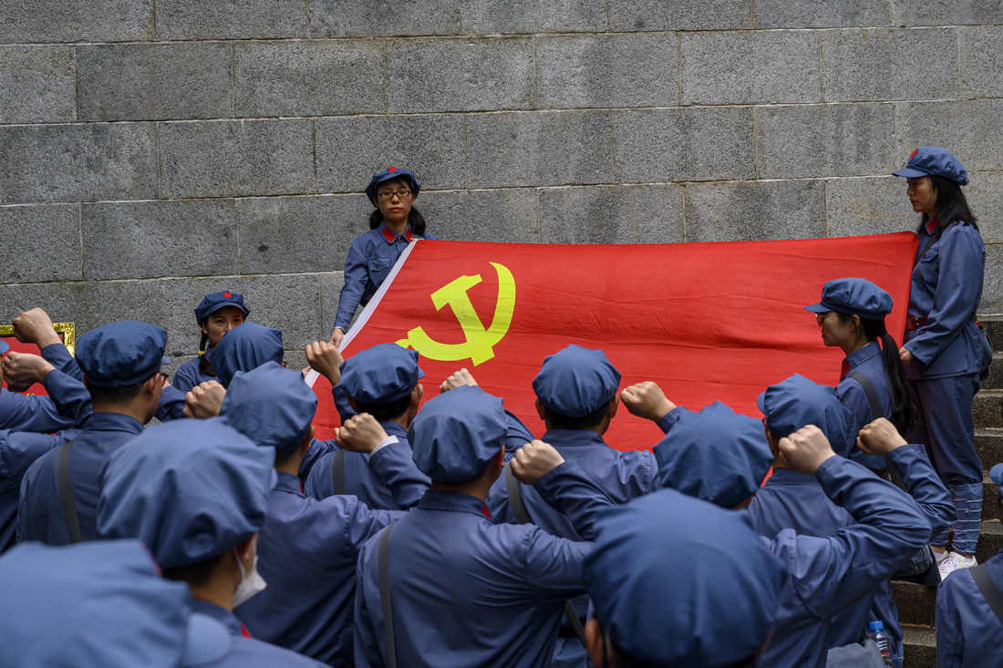 2021年4月4日,井冈山市,游客穿着红军装在井冈山革命烈士陵园重温入党誓词。