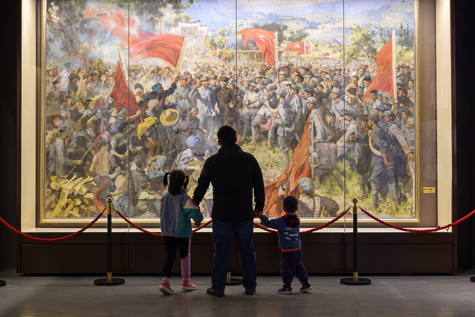 2021年4月5日,在井冈山革命博物馆内,来自珠海的游客王先生带着孩子在大型油画《井冈山会师》前驻足。本文图片除署名外均为澎湃新闻记者 孙湛 图