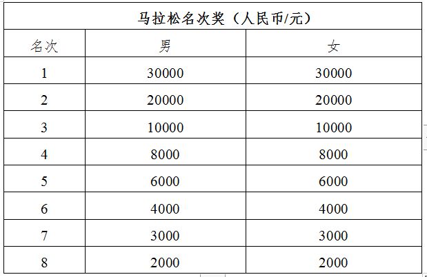 1.马拉松、半程马拉松男、女前三名各颁发奖杯一座、奖牌一枚、领奖服装一套。