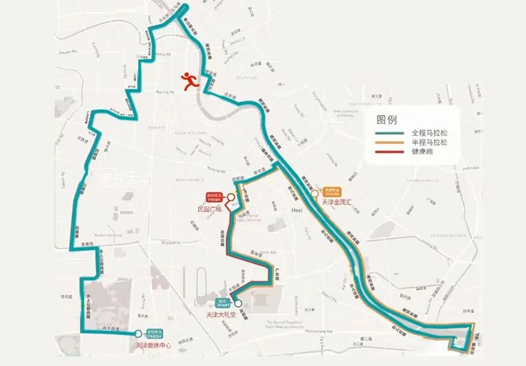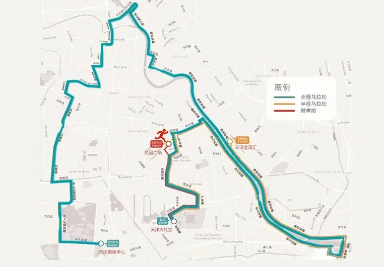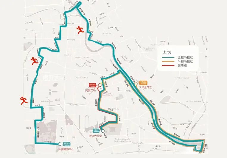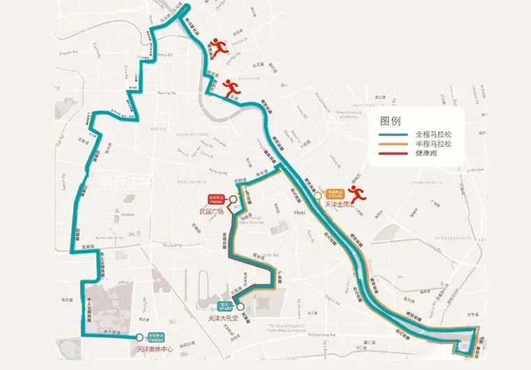 今年的天马路线回归天津主城区,贯穿了各大风景名胜、文化地标。长达42.195公里的赛道中,五大道、民园广场、世纪钟、意式风情街、天津之眼、鼓楼、周恩来邓颖超纪念馆、天津奥林匹克中心、金茂汇、天开高教科创园……美丽的自然景观、深厚的文化底蕴、极具特色的历史街区、科技与智慧浇灌的创新高地。