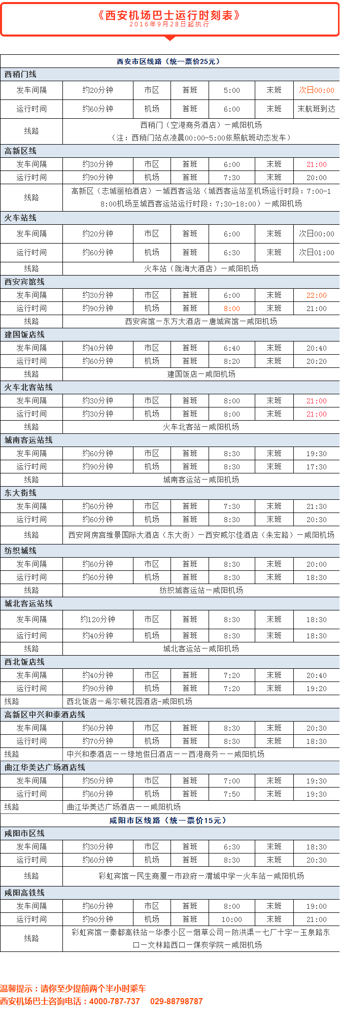根据冬春航季航班运行变化,西安机场巴士将于2016年9月28日起对部分线路运行时刻进行调整,请您注意时刻变化,及时乘坐机场巴士。线路调整详情如下: