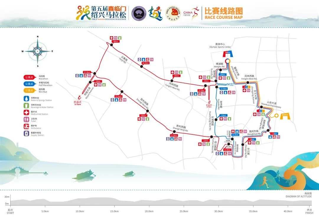 奥体中心东南侧(起点,设在解放大道与洋江西路交叉口)→(直行)解放大道→(过)镜湖大桥→(左转)凤林西路→(右转)中兴大道→(左转)二环北路(客运中心)→(右转)迪荡湖路→(左转)迪荡湖公园→(右转)迪荡湖公园内环路(绕约1/4圈)→(右转)迪荡湖公园下穿隧道→(右转)迪荡双子楼北侧→(左转)梅龙湖路→(右转)胜利东路→(过)世茂中心→(左转)中兴中路→(右转)鲁迅中路→(过)鲁迅故里→(右转)解放南路→(直行)解放北路→(左转)府山横街(古轩亭口)→(直行)府山公园东门(进)→(过)府山公园→府山公园南门(出)→(直行)府治路→(右转)偏门直街→(过)越王城广场(绍兴博物馆)→(右转)偏门直街→(右转)府山西路→(过)西园→(左转)胜利西路→(过)陆游故里→(左转)柯岩大道→(过)浙江国际赛车场→(折返)浙江国际赛车场东门→(过)柯岩风景区→(过)104国道→(直行)湖滨路→(左转)万商路→(右转)云集路→(直行)云集路→(直行)凤林西路→(右转)越西路→(折返)越西路→(直行)越西路→(右转)凤林西路(凤林大桥)→(左转)官渎路(官渎大桥)→(右转)横湖路→(左转)解放大道→奥体中心东南侧(终点,设在解放大道与洋江西路交叉口)