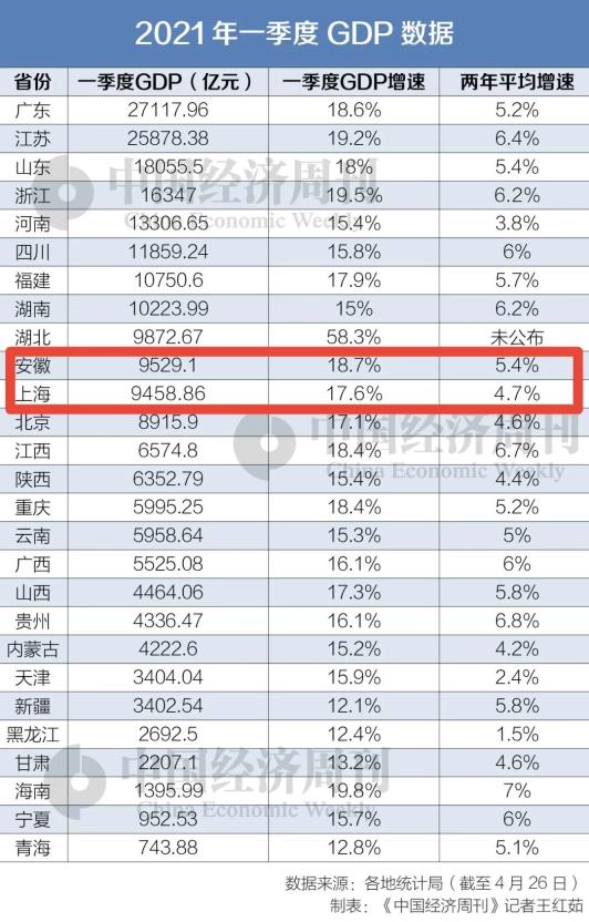 上海GDP总量9458.86亿元,同比增长17.6%;安徽GDP总量9529.1亿元,同比增长18.7%。