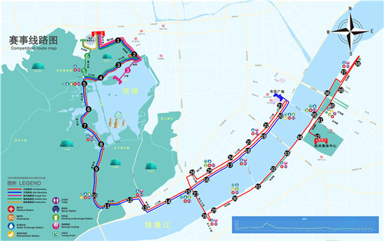 全马路线,从黄龙出发后,由曙光路经保俶路进入风景宜人的北山街,一路从杨公堤跑到虎跑路,再从虎玉路经南复路转到之江路,沿钱塘江北岸跑到市民广场;此时半马选手结束比赛,全马选手需要进行折返,从复兴大桥跑到钱塘江南岸,一路沿江边从闻涛路跑到观澜路,最后折返进入“大莲花”。