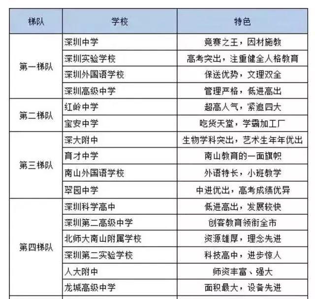 第一梯队毫无疑问被四大霸占,在这一梯队中,深中、深实验和深外的分数线常年保持在430分以上(深圳总分460分),而深高级这两年分数线在430分左右。