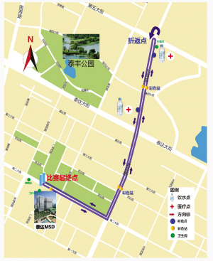 目前,2014“泰达MSD”泰达全民马拉松大赛已经进入倒计时阶段,赛前的各项准备工作正在紧张有序进行。根据组委会发布的比赛路线,参加10公里小马拉松比赛的选手将由泰达MSD广场出发,沿第二大街向东直行至北海路,再沿着北海路直行到第九大街丁字路口左转向西,沿着第九大街直行到设置在丰田汽车南门的折返点,随后原路返回至泰达MSD广场;参加5公里缤纷跑的选手,同样由泰达MSD广场起跑,沿第二大街、北海路方向奔跑至北海路和第五大街交口处的折返点,再原路返回泰达MSD广场。