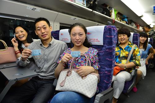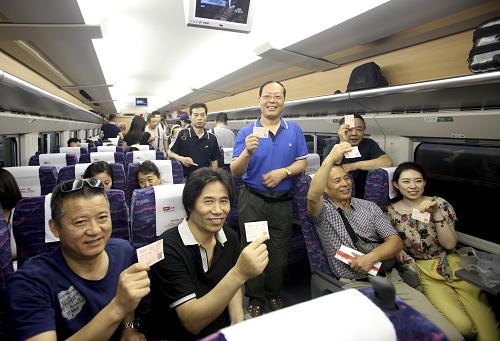 7月1日,乘坐大西高铁D2012次动车的乘客们在发车前展示车票。新华社发(许睿摄)
