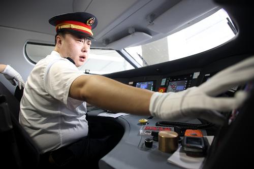 7月1日,D2012次动车司机在开车前进行设备检测。新华社发(许睿摄)