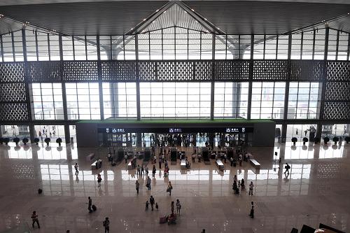 7月1日,在新建成的太原南站,乘客陆续进站。当日早8点50分,D2011次动车组列车从太原南站准时启动。大同至西安高铁(太原南至西安北段)正式开通运营。太原至西安的列车运行时间由原来的10小时缩短至3小时。新华社记者 范敏达 摄
