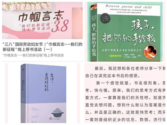 【西安航空学院】该院工会举办了“巾帼言志——我们的新征程”庆祝“三八”国际劳动妇女节线上荐书活动,引领女教职工爱上阅读、增长智慧、提升素质。活动中,女教职工们纷纷参与,在线上推荐了《思考,快与慢》《杨绛传》《孩子,把你的手给我》《被讨厌的勇气》《傅雷家书》《美的历程》等各类优质书籍36部,内容涵盖小说、传记、生活、心理、育儿、美学等方面,大家还就读书感悟、读书方法、读书乐趣等进行了分享。女教职工们表示,此次荐书活动十分有意义,今后要继续多读书、读好书,不断丰富知识、开阔视野、提升素质,以积极乐观的心态面对生活和工作,收获美好人生。