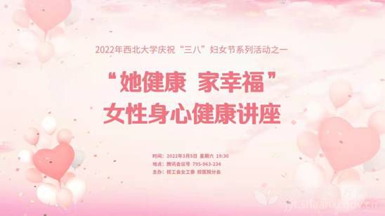 【西北大学】在第112个“三八”国际劳动妇女节到来之际,该校工会发布慰问信,谨向一直以来辛勤工作在教学、科研、管理、服务各条战线上的全体女同胞们,致以节日的祝贺和亲切的问候!该校举办了“她健康 家幸福”女性身心健康线上讲座。讲座以女性不同生命阶段遇到的健康困扰和关注的健康话题为重点,讲解妇科炎症、肿瘤、不孕症、更年期综合征等防治以及心理健康知识,引导大家养成健康的生活方式,也为大家更好地投入工作生活提供身心健康保障。该校工会组织了庆祝“三八”国际劳动妇女节趣味活动,女教职工踊跃参加跳绳、乒乓球接力比赛等趣味活动。活动进一步增强了女教职工的身体素质,丰富女教职工精神文化生活。