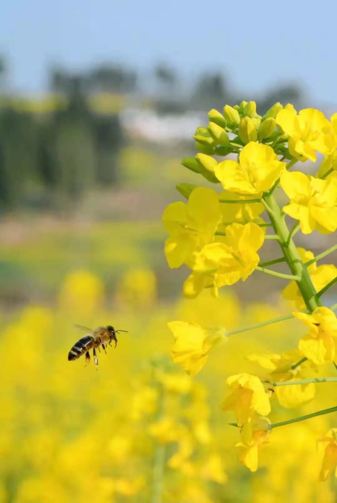 绵延不绝,金色撩人,蜂飞蝶舞,浪漫夺目,没有什么能够概括养眼的春日美景,唯有亲眼一见才能满足心愿。密集的花朵盛开,纵横的阡陌小路分布其间,穿上美丽的春装,行走在烂漫的油菜花海里,获得不可多得的沉浸式赏景体验,微风拂过,花香掠过,还有什么是比这更动人的春日际遇呢?孩子们欢闹着,大人忙不迭地拍着照,蓝天、白云、金色花海以及动人笑脸,构成了唯美的风景线。赏春,何必去远处?