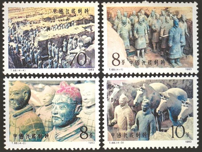 位于西安市临潼区的秦始皇陵兵马俑被誉为“世界第八大奇迹”,1983年6月30日,国家邮政部门发行了1套《秦始皇陵兵马俑》特种邮票,分别是《群俑》《陶俑》《兵马俑》和《兵马俑坑》, 外加1枚小型张《牵马俑》和1本小本票。