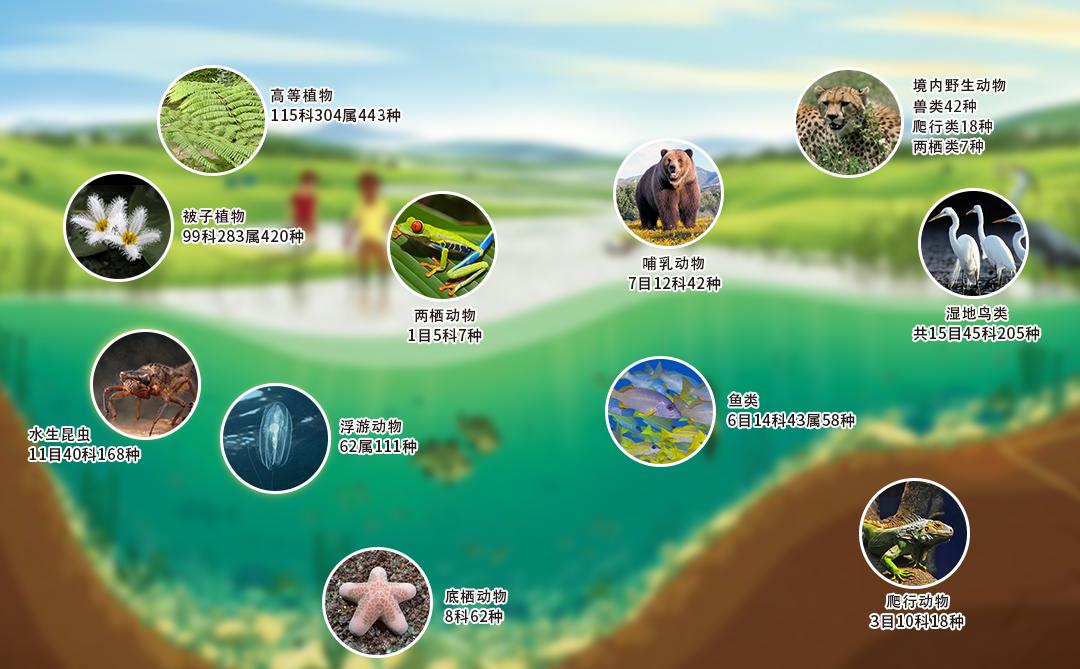 鸟类种数420余种,约占全国和全省鸟类种数的29.1%、84.5%。湿地鸟类种类众多,共15目45科205种,且国家重点保护或珍稀濒危鸟类数量大。