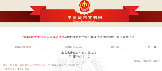 中国裁判文书网显示,2019年7月,恒丰银行青岛分行就合同纠纷起诉焦作中旅银行,请求判令后者赔偿损失6.7亿元及相应利息。2020年1月,法院作出判决,恒丰银行的诉求未获支持。