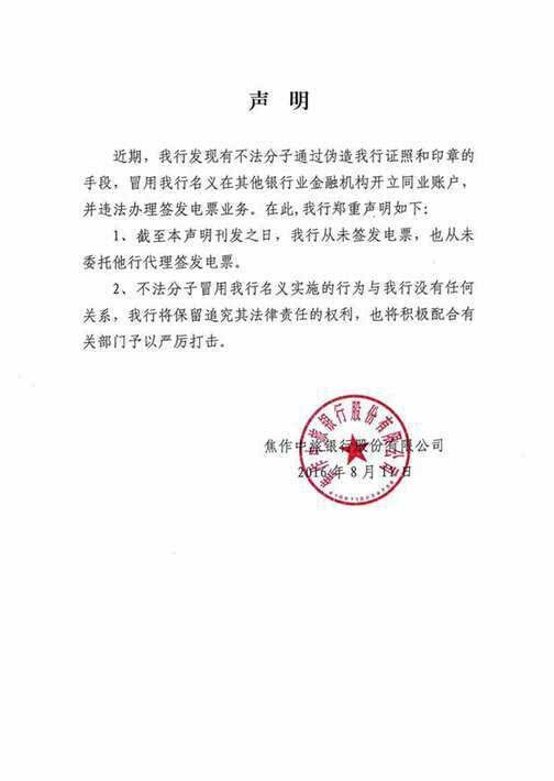 2016年8月11日,焦作中旅银行发布声明称,该行发现有不法分子通过伪造该行证照和印章的手段,冒用该行名义在其他银行业金融机构开立同业账户,并违法办理签发电票业务。该行从未签发电票,也从未委托他行代理签发电票,不法分子冒用该行名义实施的行为与该行没有任何关系。案发后,崔某、逯某、张某等人先后被抓获归案。