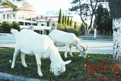 两只羊在路边的草坪悠闲地吃草。