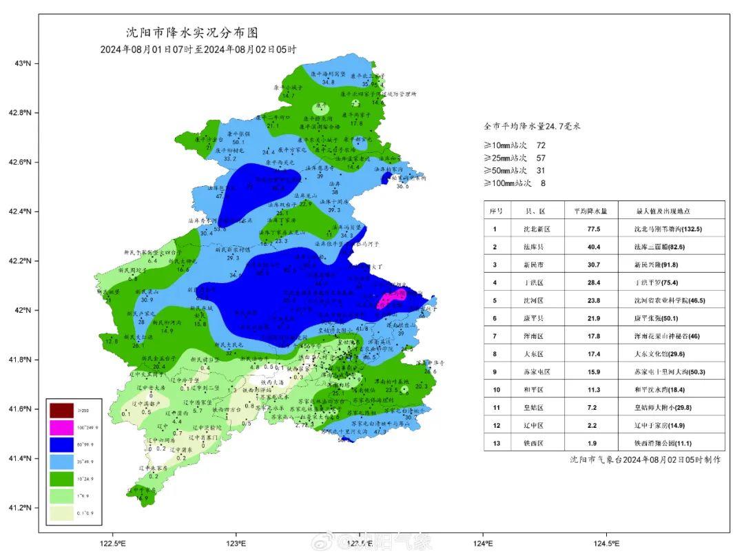 8月1日7时至2日5时,沈阳全地区平均降水量24.7毫米,最大值132.5毫米(沈北新区马刚街道苇塘沟村),最大小时降水量77.6毫米(法库三面船镇,0时47分至1时47分);城区平均降水量12.1毫米,最大值75.4毫米(于洪平罗街道),最大小时降水量38.6(于洪深国际物流园,17时26分至18时26分)。阵风风力达到8级以上的测站有9个,出现在沈北新区、新民市、法库县,最大出现在法库卧牛石乡,风力为9级(21.1m/s)。
