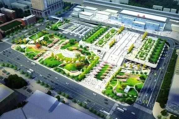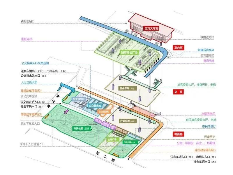 宝鸡站站前广场主体分为高台层和地面层,其中站前广场高台层与宝鸡站站房平面连接,构建中心突出、形象鲜明的城市门户。