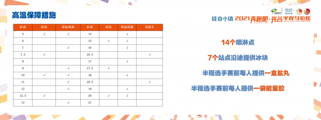 针对可能出现的高温天气,组委会制定了防暑降温方案。赛前通过防暑降温宣传,提醒选手做好参赛降温准备;半程选手每人提供遮阳帽、一盒盐丸和一袋能量胶;比赛当天,赛道沿线将设置14个喷淋点位、7个站点沿途提供冰块,增加赛道降温补给供应量。
