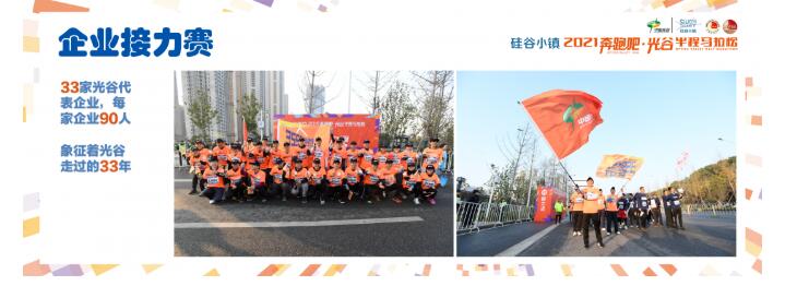 为传递红色信念和光谷精神,组委会在赛事中继续设置了企业接力跑活动。企业接力跑活动参与人员为33家光谷代表企业,每家企业90人,象征着光谷走过的33年。中国信科、长飞光纤、国药集团、小米、华星光电、华大基因等33家高新企业组成企业接力跑方阵,将党旗接力传递。