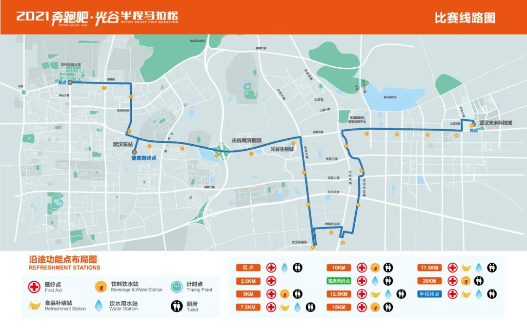 健康跑终点位于武汉东站,半程马拉松终点位于武汉未来科技城。