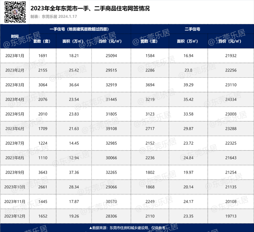 日前,东莞市住房和城乡建设局官网发布了《2023年12月东莞市商品住宅网上签约销售情况》和《2023年12月底东莞市分镇街新建商品住宅库存情况》。至此,2023年东莞楼市成绩单已全数出炉。
